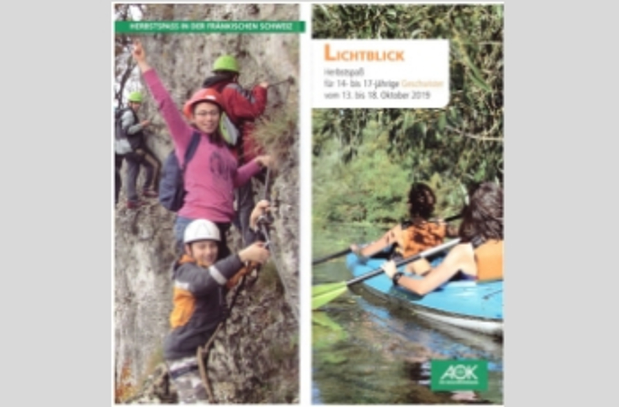 AOK Ferienfreizeiten 2019Auch in diesem Jahr bietet die AOK mit ihren Ferienfreizeiten für schwer und chronisch kranke Kinder und Jugendliche sowie deren Geschwister die Möglichkeit, neue Eindrücke und Perspektiven zu gewinnen. Osterspaß vom 23. April - 27. April 2019Für Geschwister im Alter von 8 - 13 Jahren bittet der "Osterspaß" in Hürtgenwald Abenenteuer im Wald und Aciton und Spaß in der Gruppe. Auch der Austausch mit anderen Betroffenen sollen den Kindern dabei helfen, sich in ihrer Situation nicht mehr so "alleine" zu fühlen und neues zu erleben. Herbstspaß vom 13. Oktober - 08. Oktober 2019Für die Geschwister im Alter von 14 - 17 Jahren findet im Oktober der "Herbstspaß" im Pegnitztal in Franken statt. Hier finden die Geschwister neben viel Bewegung, Aciton, Sport und Spaß auch Entspannung und Freiräume.