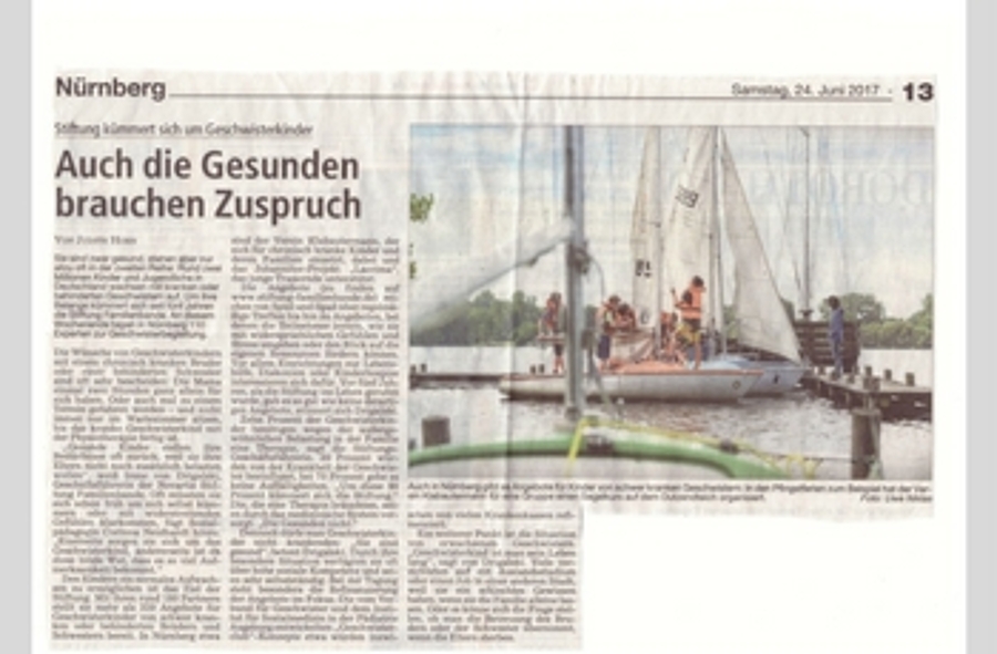 Auch die Gesunden brauchen ZuspruchNürnberger Zeitung | Judith Horn | 24. Juni 2017 Die Wünsche von Geschwisterkindern mit einem chronisch kranken Bruder oder einer behinderten Schwester sind oft sehr bescheiden: Die Mama einmal zwei Stunden ganz allein für sich haben. Oder auch mal zu einem Termin gefahren werden - und nicht immer nur im Wartezimmer sitzen, bis das kranke Geschwisterkind mit der Physiotherapie fertig ist....