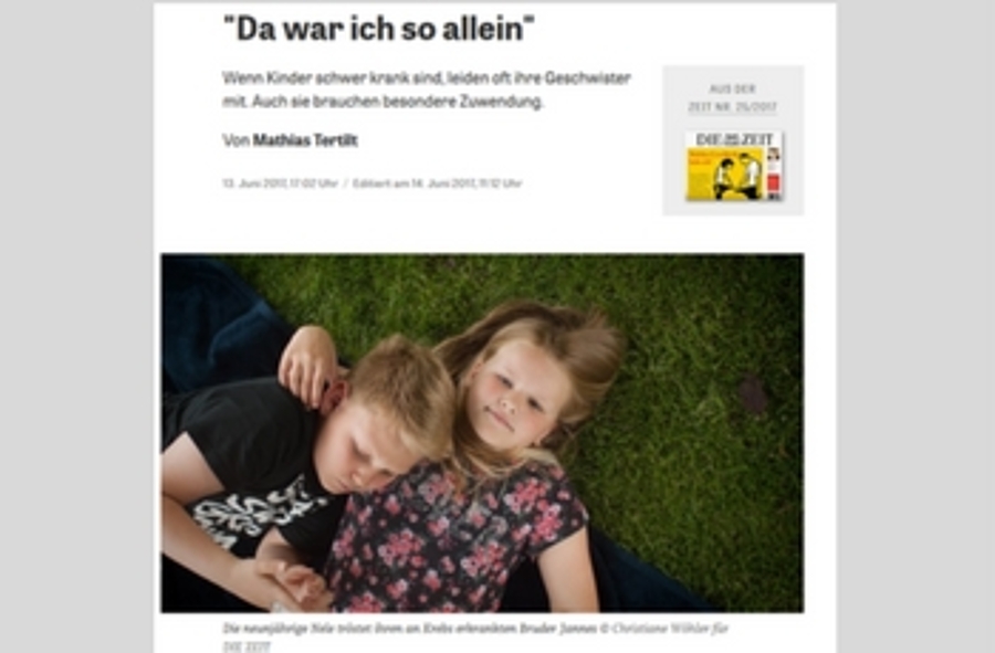 "Da war ich so allein"Die Zeit | 14.06.2017 | Mathias Tertilt "Mama hat viel mit Jannes gemacht, und ich musste weg zu Freunden", sagt die Neunjährige. "Wenn sie sich zu Hause um ihn gekümmert hat, hat sie oft nicht mehr mit mir geredet. Da war ich so allein." Gesunden Geschwistern kommt es oft vor, als stünden sie isoliert dem Rest der Familie gegenüber. "Die Zeit" macht in Ihrer Ausgabe vom 14. Juni 2017 auf die besondere Situation von Geschwister von schwer chronisch kranken oder behinderten Menschen aufmerksam. In dem Artikel kommen Experten zu Wort, die über die Bedürfnisse, Gedanken und Wünsche von betroffenen Geschwister sprechen und Betroffene kommen selbst zu Wort und erzählen einen Teil ihrer Geschichte. Es ist eine Situation, die einen das ganze Leben begleiten wird, denn: "Bruder oder Schwester ist man ein Leben lang." Hier geht´s zum Artikel |