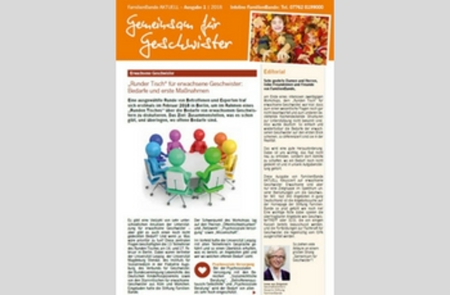 Der neue FamilienBande Newsletter ist da!Endlich ist es wieder soweit. Eine neue Ausgabe von FamilienBande AKTUELL ist da! In dieser Ausgabe erfahrt Ihr alles über den "Runden Tisch" für Erwachse Geschwister, bei dem Experten und Betroffene über Bedarfe und Maßnahem für Erwachsene Geschwister diskutierten sowie über das Fachbuch "Geschwister stärken". Außerdem stellen wir Ihnen zwei weitere Preisträger des FamilienBande Förderpreises 2016/2017 in den Kategorien "GeschwisterCLUB" und "Erwachsene Geschwister" vor. Hier geht´s direkt zum Newsletter