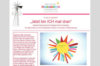 Erlebnis-Ostercamp am Irmengard-Hof im Chiemgau - noch Plätze frei!Das Ostercamp richtet sich an Geschwister von chronisch kranken oder behinderten Kindern im Alter von 8-12 Jahren. Neben verschiedenen Aktivitäten erwartet die Kinder zusätzlich Workshops, die speziell für Geschwister entwickelt wurden. Dabei wird der Austausch untereinander, der Zusammenhalt und das Verständnis für eine schwere Erkrankung gefördert. Gemäß dem Motto Jetzt bin ICH mal dran! stehen die Bedürfnisse der Geschwisterkinder im Mittelpunkt. Anmeldeschluss ist der 18. März 2017 Mehr Informationen erhalten Sie hier! |