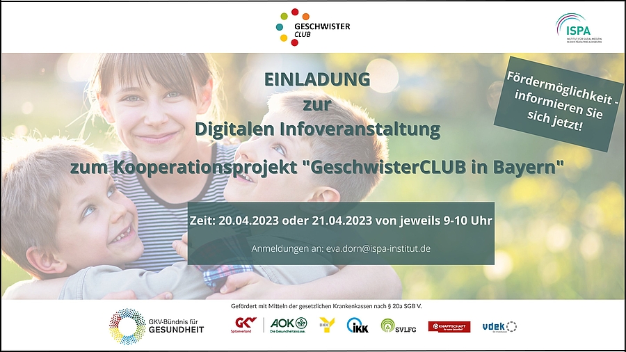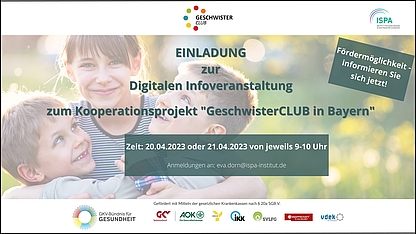 Fördermöglichkeit für den Aufbau von fünf GeschwisterCLUB-Standorten in BayernGerne möchten wir Sie über ein neues spannendes Projekt des GeschwisterCLUBs informieren. Dieser hat eine neue Fördermöglichkeit für den Aufbau von fünf GeschwisterCLUB-Standorten in Bayern aufgetan. Die Förderung kommt vom GKV-Bündnis für Gesundheit Bayern und ist ein landesweites Förderprogramm. Das Besondere ist, dass der GeschwisterCLUB an den 5 Standorten - jeweils in Kooperation eines Trägers mit einem Fachbereich der Kommunalverwaltung (Gesundheitsamt oder Jugendamt) - implementiert wird. Bei beiden Kooperationspartnern werden Stellenanteile durch die Förderung finanziert. Es wird eine digitale Infoveranstaltung geben, bei der Förderkriterien etc. ausführlich erklärt werden. Diese findet am 20.04. und 21.04.2023 von jeweils 9 - 10 Uhr statt. Anmeldungen bitte an eva.dorn@ispa-institut.de.