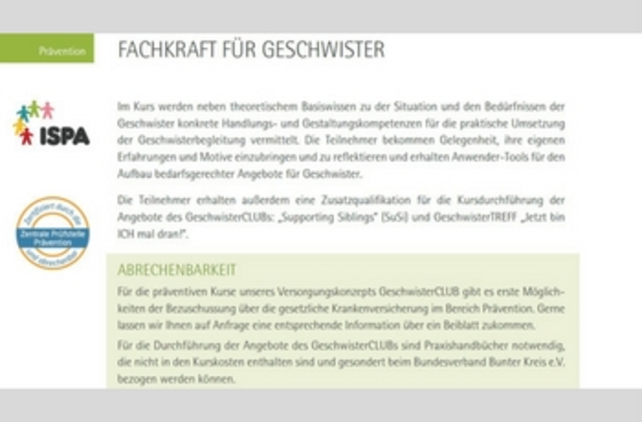 Fortbildung zur Fachkraft für GeschwisterFür Fachkräfte aus dem Sozial- und Gesundheitswesen besteht 2018 wieder die Möglichkeit, an der Fortbildung "Fachkraft für Geschwister" teilzunehmen. Diese richtet sich insbesondere an Interessenten, die mit kranken und/oder behinderten Kinder arbeiten. Neben theoretischem Basiswissen zu der Situation und den Bedürfnissen der Geschwister werden in diesem Kurs auch konkrete Handlungs- und Gestaltungskompetenzen für die praktische Umsetzung der Geschwisterbegleitung vermittelt. Nach Abschluss des Kurses erhalten die Teilnehmer außerdem eine Zusatzqualifikation für die Kursdurchführung der Angebote des GeschwisterCLUBs: "Supporting Siblings" (SuSi) und GeschwisterTREFF "Jetzt bin ICH mal dran". (Mehr Informationen zum GeschwisterCLUB) Termine Basismodul: 05.03.-07.03.2017 Aufbaumodul: 08.10.-10.10.2017