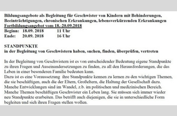 Fortbildungsangebot für Begleiter von GeschwisternIn der Begleitung von Geschwistern ist es von entscheidender Bedeutung, eigene Standpunkte zu ihren Fragen und Auseinandersetzungen zu finden, zu all den Herausforderungen, die das Leben in einer besonderen Familie bedeuten kann. Dazu ist es eine Voraussetzung, ihre Standpunkte zu den wichtigen Themen, die sie beschäftigen, kennen zu lernen - auch die der Eltern und Großeltern. Für alle Fachleute, die sich mit der Lebenssituation von Geschwistern auseinandersetzen, eigene Angebote schaffen wollen oder bereits durchführen veranstaltet die Dipl. Sozialwissenschaftlerin Marlies Winkelheide ein Fortbildungsangebot als Begleitung für Geschwister von Kindern mit Behinderungen, Beeinträchtigungen, chronischer Erkrankungen oder lebensverkürzenden Termin: 18.09.2018 - 20.09.2018 Anmeldeschluss ist der 30.05.2018 |