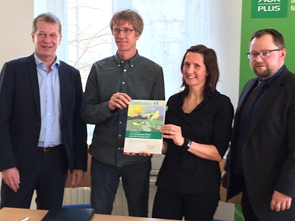 2. Bild von links nach rechts: Ottmar Walz (Geschäftsführer AOK PLUS), Markus Wulftange (Verbund für Geschwister/Elternhilfe Leipzig), Ulrike Grundmann (Verbund für Geschwister/Sonnenstrahl e.V. Dresden), Andreas Führlich (Vorstandsvorsitzender Sonnenstrahl e.V.). |