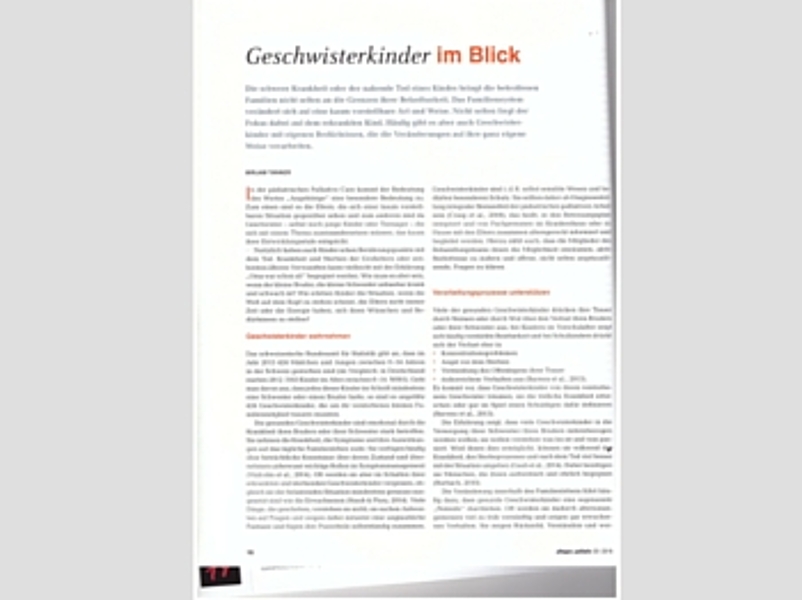 "Geschwisterkinder im Blick"Bedeutung von Geschwistern in der pädiatrischen Palliativ Care Die schwere Krankheit oder der nahende Tod eines Kindes ist für jedes Familiensystem eine große Belastung, sowohl für die Eltern als auch für die Geschwisterkinder. Mirjam Tanner beschreibt in ihrem Artikel „Geschwisterkinder im Blick“ die Bedeutung der Geschwisterkinder in der pädiatrischen Palliativ Care. Darüber wie wichtig es ist, die Geschwisterkinder wahrzunehmen, ihre Verarbeitungsprozesse zu unterstützen und ihnen Normalität zu ermöglichen. Sie beschreibt Hilfestellungen für die Begleitung der Geschwisterkinder sowie konkrete Anlaufstellen für das soziale Umfeld. Den ganzen Artikel lesen Sie hier |
