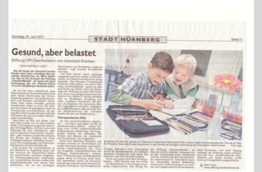 Gesund, aber belastetNürnberger Nachrichten | Hartmut Voigt | 24.06.2017 Es ist nur allzu menschlich, dass Eltern ihrem an Krebs leidenden Kind oder ihrem Nachwuchs mit Down-Syndrom möglichst viel Aufmerksamkeit und Energie zukommen lassen. Doch nicht selten kommen gesunde Geschwister dabei zu kurz. Sie müssen mit einem viel geringeren Grad an Zuwendung zurechtkommen, oft genug für ihren kranken Bruder oder die Schwester da sein und eigene Bedürnisse zurückstellen. Die Nürnberger Nachrichten berichteten am 24.06.2017 anlässlich der 5. FamilienBande Fachtagung über die gesunden, aber dennoch teilweise belasteten Geschwister von chronisch kranken oder behinderten Kindern. Hier geht´s zum Artikel |