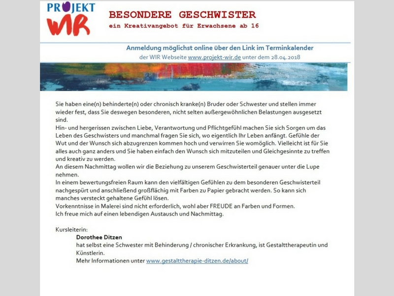 Jetzt noch anmelden: Kreativ-Workshop "Besondere Geschwister"Das Projekt "Wir" der Lebenshilfe Frankfurt am Main veranstaltet zusammen mit der Gestalttherapeutin und Künstlerin Dorothee Ditzen einen Kreativ-Workshop für "Besondere Geschwister" ab 16 Jahren. Am 28. April 2018 soll im Atelier von Frau Ditzen die Beziehung zu dem kranken Geschwisterteil genauer unter die Lupe genommen werden. Die vielfältigen Gefühle können in einem bewertungsfreien Raum nachgespürt und großflächig mit Farbe zu Papier gebracht werden. Meldet euch jetzt noch an und sichert euch die letzten Plätze für den Kreativ-Workshop. Genauere Informationen findet Ihr im Link. Anmeldung & weitere Informationen |