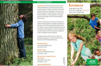 LICHTBLICK - Osterspaß in der Eifel: Energie für GeschwisterLICHTBLICK der AOK Rheinland/Hamburg bietet Geschwistern die Möglichkeit, fernab vom Alltag, neue Eindrücke und Perspektiven zu gewinnen. Die Geschwister erwartet neben Abenteuer im Wald, Sport, Action und Spaß auch Entspannung und Freiräume. In diesem Jahr geht es für die Geschwisterkinder vom 03.04.-07.04.2018 nach Hürtgenwald in der Eifel ins Jugendwaldheim Raffelsbrand. Mitfahren können alle Kinder und Jugendlichen im Alter von 8-13 Jahren mit chronisch kranken Geschwistern. Weitere Informationen & Anmeldung |