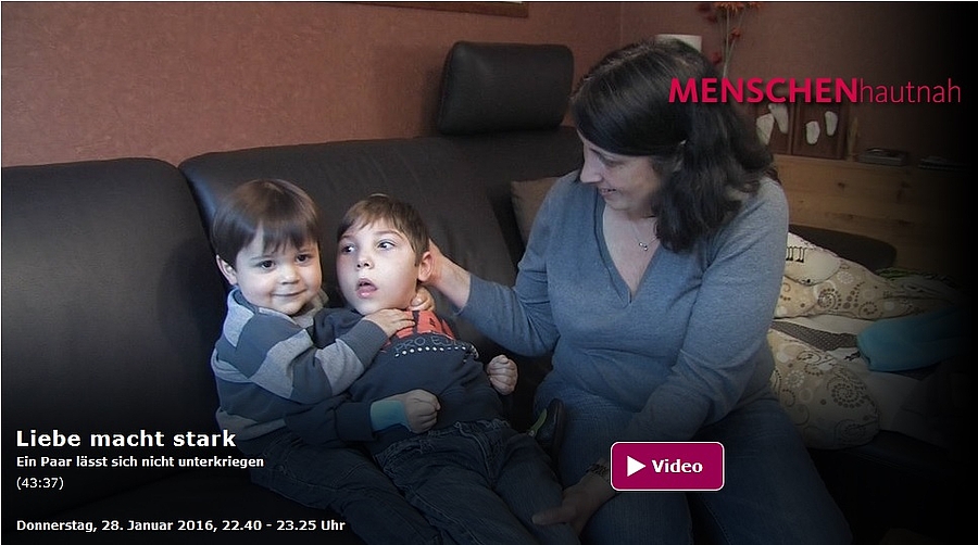 Liebe macht starkDokumentation im WDR Seit über sechs Jahren dreht sich Susanas und Erics Leben um ihren mehrfach behinderten Sohn Luca. Doch dann kommt ihr zweiter Sohn Raphael gesund zur Welt. Die beiden erleben jetzt zum ersten Mal eine Art "normales" Familienleben. Der kleine Raphael wächst zusammen mit Luca auf. Und Raphael geht völlig vorbehaltslos und liebevoll mit Luca um. Aber langsam merkt er: Luca ist anders. Und Luca muss lernen: Seine Eltern können sich jetzt nicht mehr nur um ihn kümmern. WDR Menschen hautnah, 28.01.2016 Das Video zur Sendung gibt es hier |