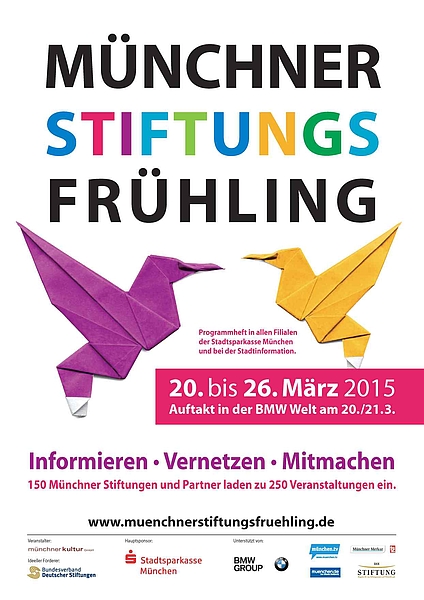 MünchnerStiftungsFrühling 2015Die Stiftung FamilienBande ist vor Ort - Besuchen Sie uns! Informieren - Vernetzen - Mitmachen: Beim MünchnerStiftungsFrühling ist der Stiftungsalltag zum Greifen nahe und erlebbar. Vom 20. bis 26. März 2015 zeigen rund 150 Stiftungen, welche Tatkraft, Engagement und Erfolge es dank Stiftungen und deren Mitarbeitern in den unterschiedlichen Lebensbereichen gibt. In Workshops, Vorträgen, Lesungen, Führungen und anderen Formaten zeigen sie ihre thematischen Schwerpunkte und liefern damit Zündstoff zum Informieren, Mitmachen, Nachdenken und Nachahmen, v.a. aber zum Kennenlernen. Einem zentralen Auftakt in der BMW Welt am 20./21. März mit Informationsständen und unterschiedlichen Einzelveranstaltungen folgen dezentrale Angebote (22.-26. März), bei denen die Stiftungen direkt bei sich oder ihren Projektpartnern die Pforten öffnen und interessierte Bürger zu sich einladen. Neben Einblicken in aktuelle Projekte erhalten Besucher auch Fachwissen rund um das Thema Stiftungsmanagement. Stiftungen sind lebendig und haben lebendige und engagierte Mitarbeiter. Überzeugen auch Sie sich davon und schauen mal vorbei. Die Stiftung Familienbande finden Sie am Stand C1. Wir freuen uns auf Ihren Besuch! Weitere Infos zum Münchner Stiftungsfrühling gibt es hier. |