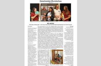 Neu: Die Geschwister-RundschauDer Geschwisterrat - eine feste Institution der Janusz Korczak-Geschwisterbücherei - hat vor kurzem die Geschwister-Rundschau ins Leben gerufen. Die erste Zeitschrift von Geschwistern für Geschwister. Die Geschwister-Rundschau soll Geschwisterkindern eine Stimme geben und die Möglichkeit, ihre Anliegen zu veröffentlichen. Berichtet werden soll beispielsweise über die Arbeit im Geschwisterrat, "Korczak heute" sowie aus der JKG, der Trauergruppe und dem Leseclub. Außerdem wird es Buchbesprechungen und Texte über Medien wie Briefe, Tagebücher und Beiträge von erwachsenen Geschwistern, interessierten Eltern und einem Auslandskorrespondenten geben. Der Geschwisterrat