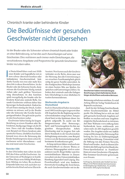 Neuer Artikel über Geschwister und FamilienBandein pädiatrie hautnah erschienen Wir freuen uns über den Artikel "Die Bedürfnisse der gesunden Geschwister nicht übersehen" in pädiatrie hautnah in der Ausgabe 5, erschienen im Oktober 2015. In dem Artikel geht es nicht nur um die Situation von Geschwistern allgemein, sondern auch um die Entwicklung des Themas in den USA und die neuesten Projekte in der Geschwister-Szene, bei denen die Stiftung FamilienBande natürlich mitmischt. Zum Artikel geht es hier |