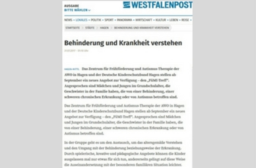 Neues Angebot für Geschwister - Behinderung und Krankheit verstehenWestfalenpost | 31.07.2017 Das Zentrum für Frühförderung und Autismus-Therapie der AWO in Hagen und der Deutsche Kinderschutzbund Hagen stellen ab September eine neues Angebot zur Verfügung - den "FüMI-Treff". Er richtet sich an Mädchen und Jungen im Grundschulalter, die Geschwister in der Familie haben, die von einer Behinderung, einer chronischen Erkrankung oder von Autismus betroffen sind. Im Vordergrund steht der Austausch, das altersgemäße Verstehen und der Umgang mit Behinderung. Mehr Informationen finden Sie hier |