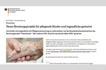 Neues Projekt für pflegende Kinder und Jugendliche gestartetDas Bundesfamilienministerium hat für Kinder und Jugendliche mit Pflegeverantwortung das Beratungsprojekt "Pausentaste" gestartet. Etwa 230.000 Kinder und Jugendliche pflegen in Deutschland regelmäßig ihre Eltern oder Geschwister. "Mit der Pausentaste starten wir in Kooperation mit der "Nummer gegen Kummer" ein anonymes Hotline- und E-Mail-Angebot. Auch ist die Website www.pausentaste.de jetzt online gestellt. Damt geht das erste Unterstützungsangebot auf Bundesebene für pflegende Kinder und Jugendliche ans Netz, das Fragen rund um die Pflege beantwortet und Hilfestellung in belastenden Situationen bietet. Denn: Wer anderen hilft, braucht eben manchmal auch selber Hilfe.", so Bundesfamilienministerin Dr. Katharina Barley. Hier gibt es weitere Informationen |