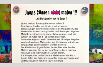 NOCH FREIE PLÄTZE! Geschwisterkinder Workshop für Teenager: Jungs können nicht malenIn der Jahresgruppe des Geschwisterkinder-Netzwerks "Mal-Zeit" sind in der Jungsgruppe noch Plätze frei. Bei dem Workshop sollen Jungs im Alter von 8-18 Jahren das Wesen des Malens ergründen und ihren eigenen Malstil entdecken. Der Workshop findet jeden 2. Samstag im Monat im Malatelier eigenArt in Hannover statt. Weitere Informationen gibt es hier Termine |
