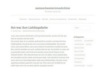 "Rot war ihre Lieblingsfarbe"meineschwestertotundichhier.wordpress.com | 17.08.2016 „Es war leicht für mich zu wissen, was meine Schwester mochte und was nicht. Und was sie dachte, das wusste ich auch, sie war ja schließlich meine Schwester. […] Wenn die anderen Menschen nach ihrem Tod über sie sprachen, dann sprachen sie nur darüber, dass sie behindert gewesen war, und dass sie nichts konnte, noch nicht mal denken, und dass ihr Gehirn kaputt gewesen war, und niemand sprach davon, dass Rot ihre Lieblingsfarbe gewesen war“ Im Blog meineschwestertotundichhier schreibt ein Geschwisterkind über den Verlust der Zwillingsschwester, die von Geburt an schwerstbehindert war und im Alter von fünf Jahren verstarb. Den Ganzen Text gibt es hier |