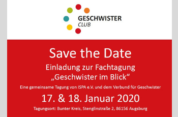 SAVE THE DATE: Fachtagung „Geschwister im Blick“Unter dem Motto „Geschwister im Blick“ laden das Institut für Sozialmedizin in der Pädiatrie Augsburg (ISPA e.V.) und der Verbund für Geschwister zur gemeinsamen Fachtagung ein. Die Tagung richtet sich an Fachpersonen aus der Begleitung von Geschwistern von Kindern mit chronischer Erkrankung oder Behinderung sowie an Interessierte. WANN: 17. & 18. Januar 2020 WO: Bunter Kreis, Augsburg Während der zweitägigen Veranstaltung werden Vorträge und praxisorientierte Workshops den Teilnehmern einen umfangreichen Überblick über aktuelle Entwicklungen in der Praxis und Wissenschaft geben. Das Programm sowie detaillierte Informationen zur Anmeldung erhalten Sie rechtzeitig vorab. Zudem werden die Unterlagen zum Download unter www.geschwisterclub.de verfügbar sein. Das ISPA und der Verbund für Geschwister freuen sich, wenn Sie sich den Termin schon jetzt in Ihrem Kalender reservieren. |