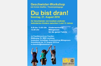 Termintipp: Geschwister-Workshop "Jetzt bist Du dran!"Raum für Geschwister Der Verein "Raum für Geschwister" veranstaltet am Sonntag, den 21. August 2016, den Geschwister-Workshop "Du bist dran!" für Geschwister von kranken und/oder behinderten Kindern. Der Workshop ist kostenlos und findet im Familienzentrum Familie+ in Lenzburg in der Schweiz statt. Der Verein "Raum für Geschwister" wurde 2015 mit dem FamilienBande Förderpreis in der Kategorie "Innovation/ Erstprojekt" ausgezeichnet. Mehr Infos zum Workshop gibt es hier |