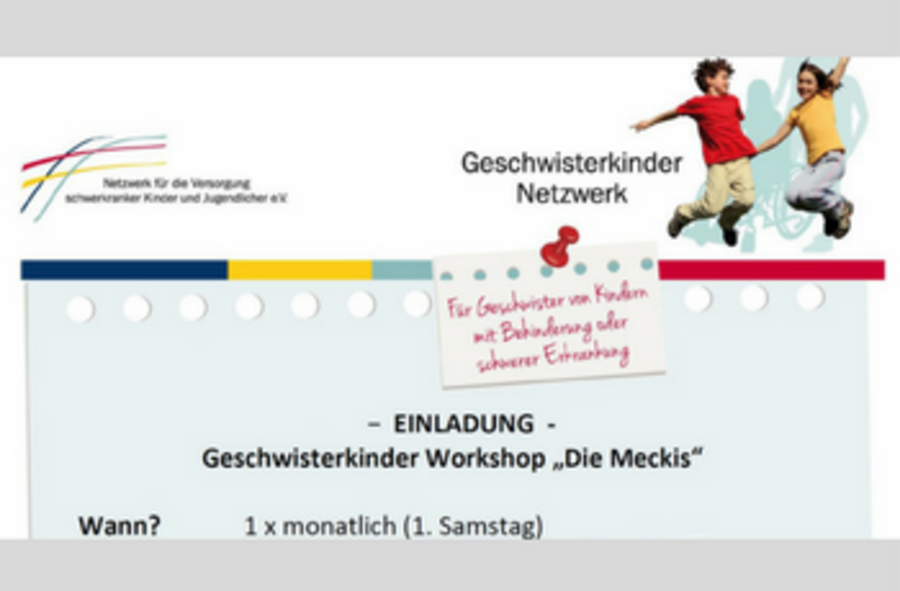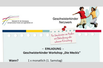 Termintipp: Geschwisterkinder Workshop "Die Meckis"Der Geschwisterkinder Workshop "Die Meckis" richtet sich an alle betroffenen Geschwisterkinder im Alter von 6-11 Jahren. Einmal im Monat (1. Samstag) treffen sich die Geschwisterkinder zum reden, basteln, toben, essen und schauen gemeinsam, wie sie mit der besonderen Situation umgehen. Weitere Infos gibt es hier |