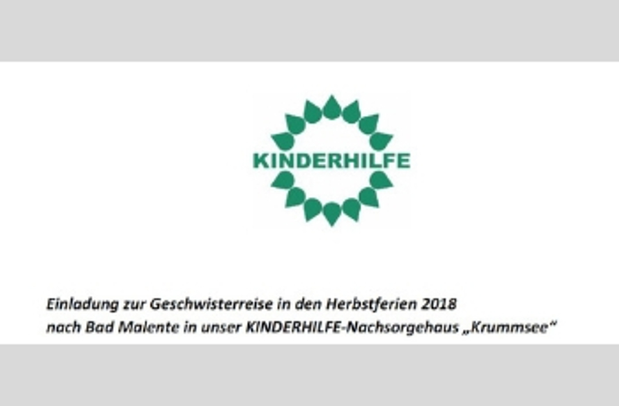 Termintipp: Geschwisterreise nach Bad MalenteUnter dem Motto "Und ich?!" bietet die Kinderhilfe - Hilfe für krebs- und schwerkranke Kinder e.V. eine Geschwisterreise nach Bad Malente an. Vom 28.10.-03.11.2018 erwartet die Geschwisterkinder im Alter von 7-12 Jahren jede Menge Spaß und Abenteuer sowie Workshops und Selbsterfahrungen. Außerdem haben die Geschwister die Möglichkeit andere Kinder kennenzulernen, die in einer ähnlichen Familiensituation leben. Alle weiteren Infos zur Anmeldung finden Sie im Link Anmeldung & Informationen |