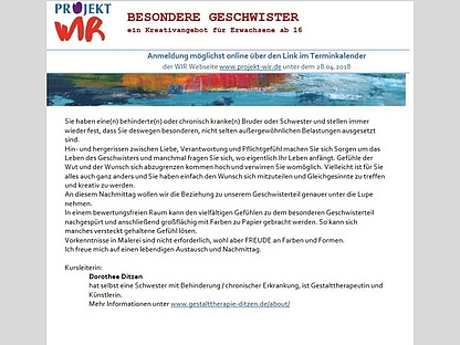 Termintipp: Kreativ-Workshop "Besonder Geschwister"Zum Wochenende haben wir wieder einen Termintipp für euch. Das Projekt "Wir" der Lebenshilfe Frankfurt am Main veranstaltet zusammen mit der Gestalttherapeutin und Künstlerin Dorothee Ditzen einen Kreativ-Workshop für "Besondere Geschwister" ab 16 Jahren. Am 28. April 2018 soll im Atelier von Frau Ditzen die Beziehung zu dem kranken Geschwisterteil genauer unter die Lupe genommen werden. Die vielfältigen Gefühle können in einem bewertungsfreien Raum nachgespürt und großflächig mit Farbe zu Papier gebracht werden. Genauere Informationen findet Ihr im Link. Weitere Informationen |