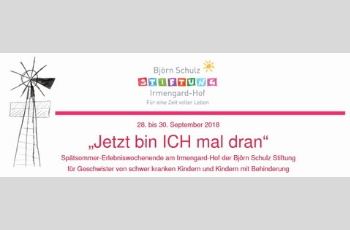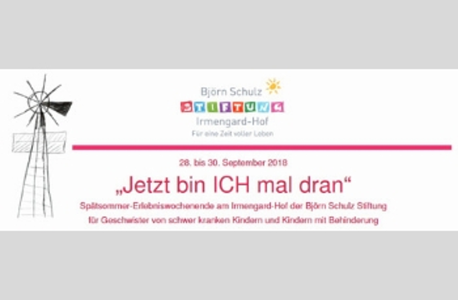 Termintipp: Spätsommer am Chiemsee - Jetzt noch anmelden!Die Björn Schulz Stiftung bietet für alle Geschwister von chronisch und schwerstkranken Kindern sowie von Kindern mit Behinderung im Alter von 8-12 Jahren ein Spätsommer-Erlebniswochenende am Irmengard-Hof in Gstadt am Chiemsee an. Vom 28.09.-30.09. haben Geschwister die Möglichkeit, Ausflüge in Bergland, an die Seen und in der unmittelbaren Umgebung zu genießen und dabei auch andere Geschwisterkinder kennenzulernen. Ganz nach dem Motto "Jetzt bin ICH mal dran!" stehen während des ganzen Wochenendes die Bedürfnisse der Geschwister im Mittelpunkt. Anmeldeschluss: 07. September 2018 Weitere Informationen findet Ihr im Link. Infos & Anmeldung |
