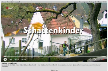 TV Tipp: Schattenkinder3sat | Bedoners normal | 02.02.2018 Am 02.02.2018 zeigte 3sat in seiner Sendung "Besonders normal" einen ca. 30-minütigen Beitrag zum Theama Schattenkinder. Familie Bader lebte lange Zeit im Eltern-Wohnbereich der Uni-Kinderklinik Heidelberg. Sohn Henry ist schwer krank. Seine Brüder Louis und Emil sind tagsüber im Kinderplanet, eine KITA für Geschwister von schwer kranken Kindern. Im Beitrag erzählt die Familie von ihrem Alltag und wie Henrys Krankheit ihr Leben beeinflusst. Auch die 22-jährige Alicia, die vor kurzem von zu Hause ausgezogen ist, berichtet über Ihr Aufwachsen mit Ihrem behinderten Bruder Benedikt. Sonja, die mittlerweile ebenfalls erwachsen ist, besucht regelmäßig ihre behinderte Schwester Nadja. Auch sie berichtet von ihrem gemeinsamen Weg. Hier geht´s zum Video |