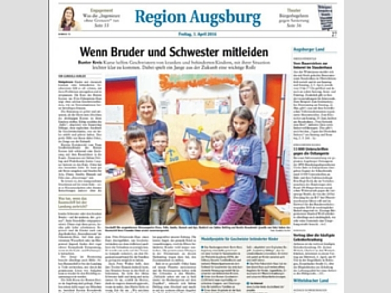 Wenn Brüder und Schwester mitleidenBericht in der Augsburger Allgemeinen über die SuSi-Kurse für Geschwisterkinder in Augsburg, die mit Hilfe der Stiftung Familienbande entwickelt wurden. Mutter Petra Weiher erzählt darin, dass sie hoffe, dass ihre Tochter Hannah durch ihre Teilnahme ihre Situation als Geschwisterkind besser in den Griff bekomme. „Hannah liebe ihre kleine Schwester heiß und innig und stehe immer für sie, doch sie reagiere dennoch aggressiv, wenn sie meint, ihre Mutter hätte zu wenig Zeit für sie.“ Den ganzen Artikel gibt es hierDer Präventionskurs SuSi (Supporting Siblings) ist ein Lebenskompetenztraining für Geschwister chronisch kranker, schwer kranker und/oder behinderter Kinder, das die Stressbewältigung, die Sozialkompetenz und das Selbstwertgefühl fördert. Mehr Infos zum SuSi Kurs gibt es hierMehr Infos zu Kursterminen finden Sie in unserem Terminkalender oder in der Angebots-Suche unter dem Suchbegriff SuSi. |