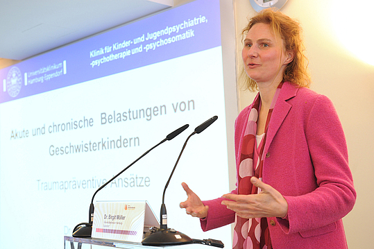 Dr. Birgit Möller, Universitätsklinikum Hamburg-Eppendorf, referierte über die besonderen Belastungen von Geschwisterkindern vor dem Hintergrund der verschiedenen Entwicklungsphasen und des Zusammenspiels von äußeren sowie inneren Stressoren und Bewältigungsmöglichkeiten. Dabei wurden die Risiken für eine Traumatisierung thematisiert und unterschiedliche Ansätze zur Prävention vorgestellt. |